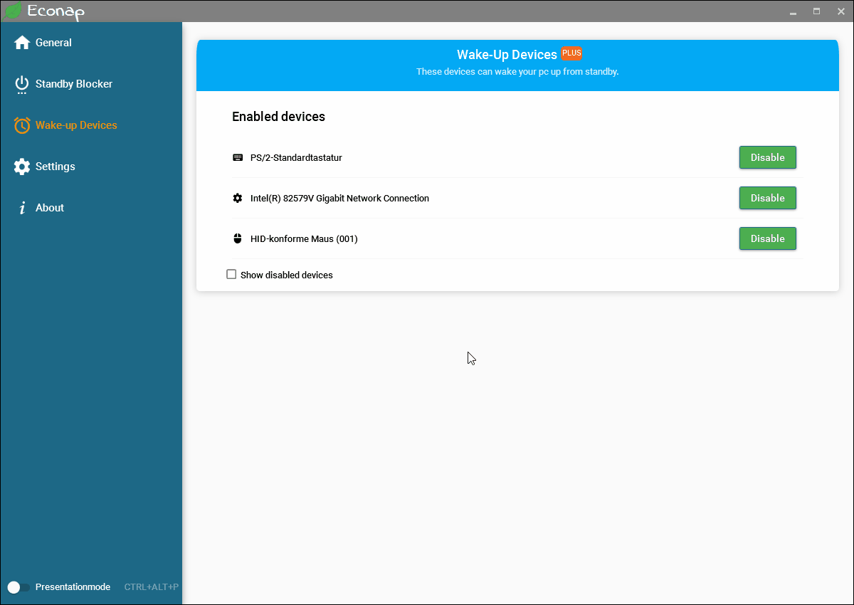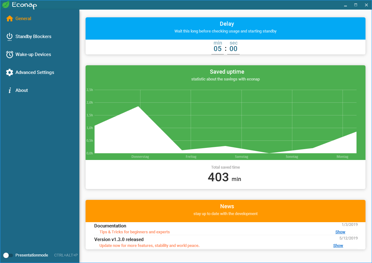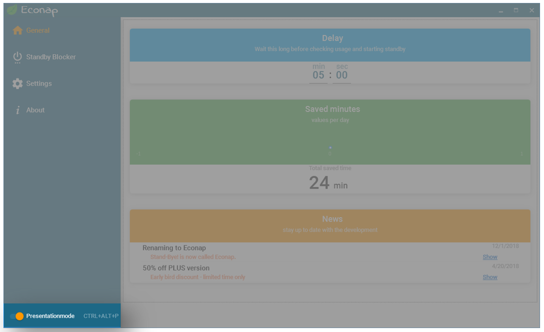 Econap also offers the possibility to automatically activate the presentation mode when connecting an extended and/or a duplicated monitor, This is especially useful for meetings and presentations where the standby has already caused several black screens and hectic wake-up attempts.
